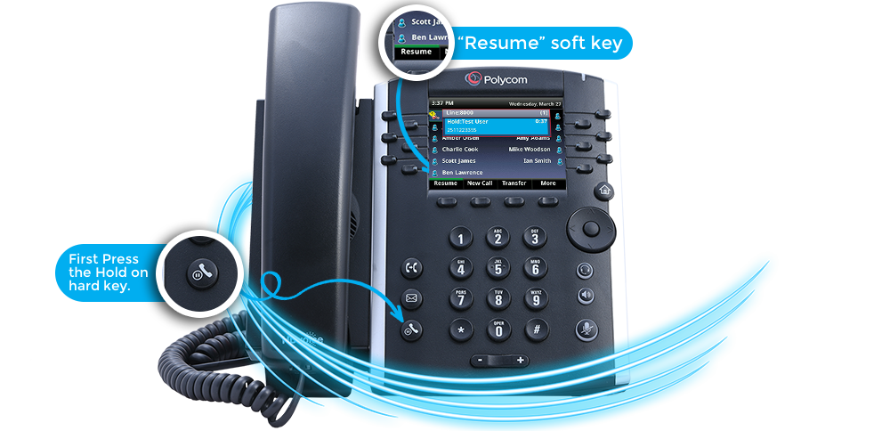 The screen will change to show that the call is now held. To remove the hold, press the “Resume” soft key" and the call will reconnect.