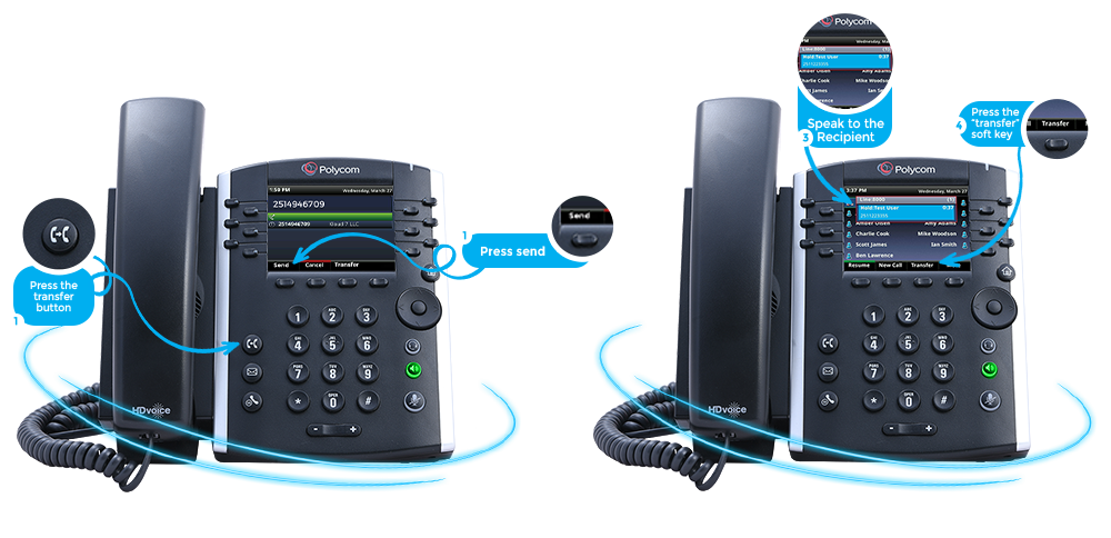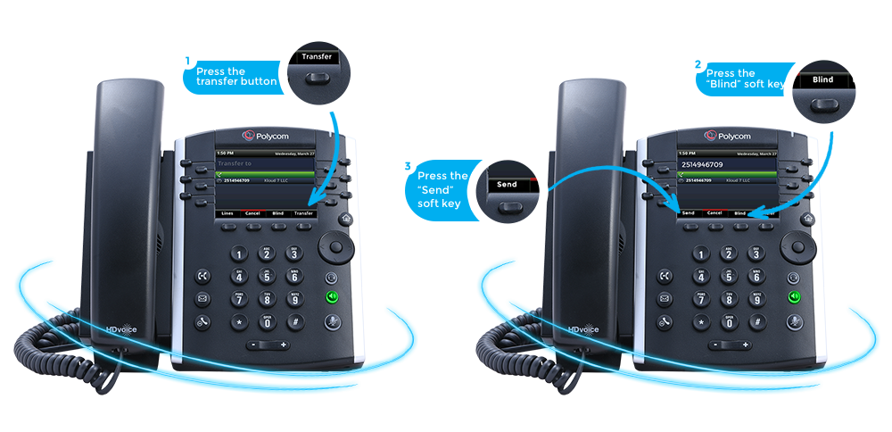 A blind transfer has 4 steps, First, press the transfer button or “Transfer” soft key. Second, press the “Blind” soft key. Third, enter the recipient's phone number or extension. Fourth, press the “Send” soft key.