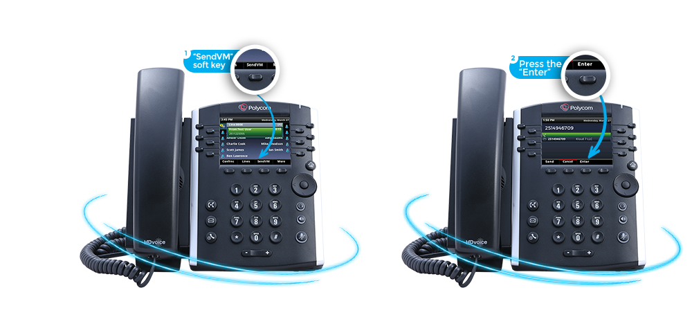 A voicemail transfer has 2 steps. First, press the “SendVM” soft key. Second, enter the recipient's extension and press the “Enter” soft key to complete the transfer