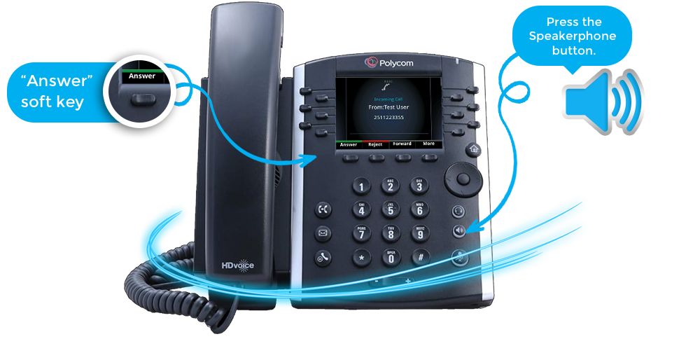 To answer a call using the speakerphone, leave the handset on the phone and press the “Answer” soft key or press the physical speakerphone button on your phone.