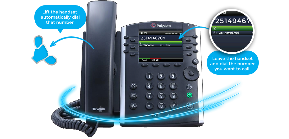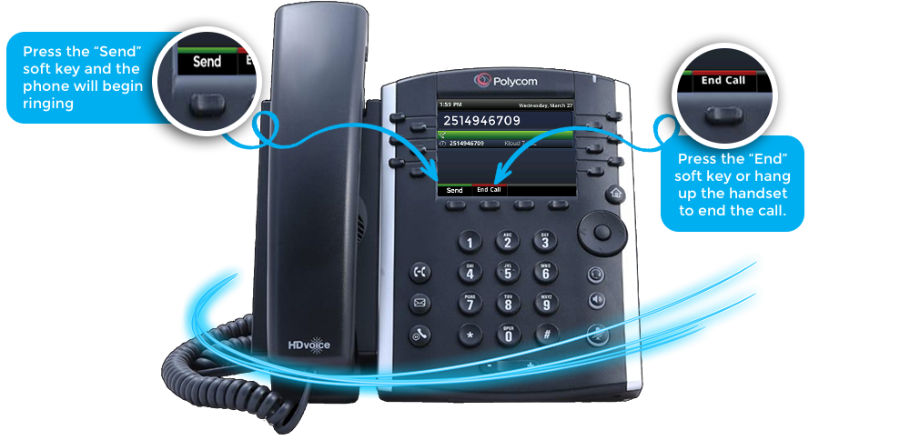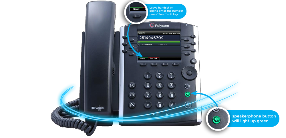 To initiate a call using speakerphone, leave the handset on the phone and enter the number you want to call. When you are ready press the “Send” soft key. you speakerphone button will light up green.